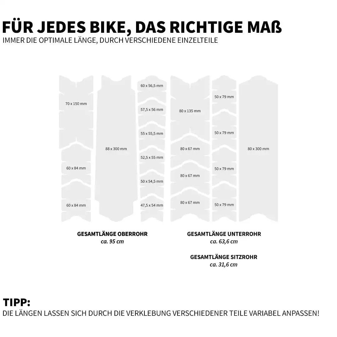 Das Rahmenschutzset L beinhaltet Schutzfolie für deinen Hauptrahmen, also für Oberrohr, Unterrohr und Sitzrohr, es besteht aus 19 Einzelteilen!