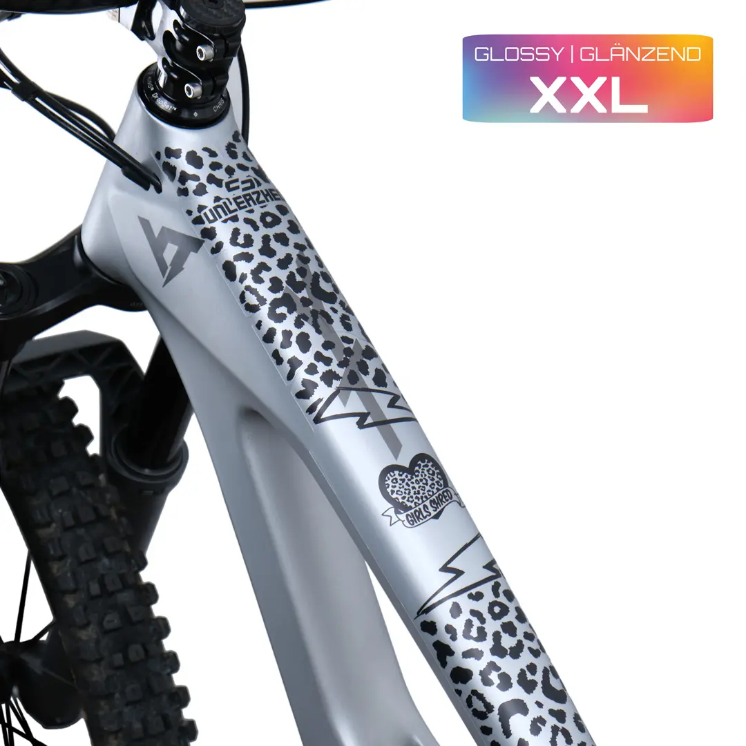 The XXL frame protection set includes bicycle foil for your entire frame, i.e. for the top tube, down tube, seat tube, and rear triangle (seat stays and chain stays), and consists of 35 individual parts!