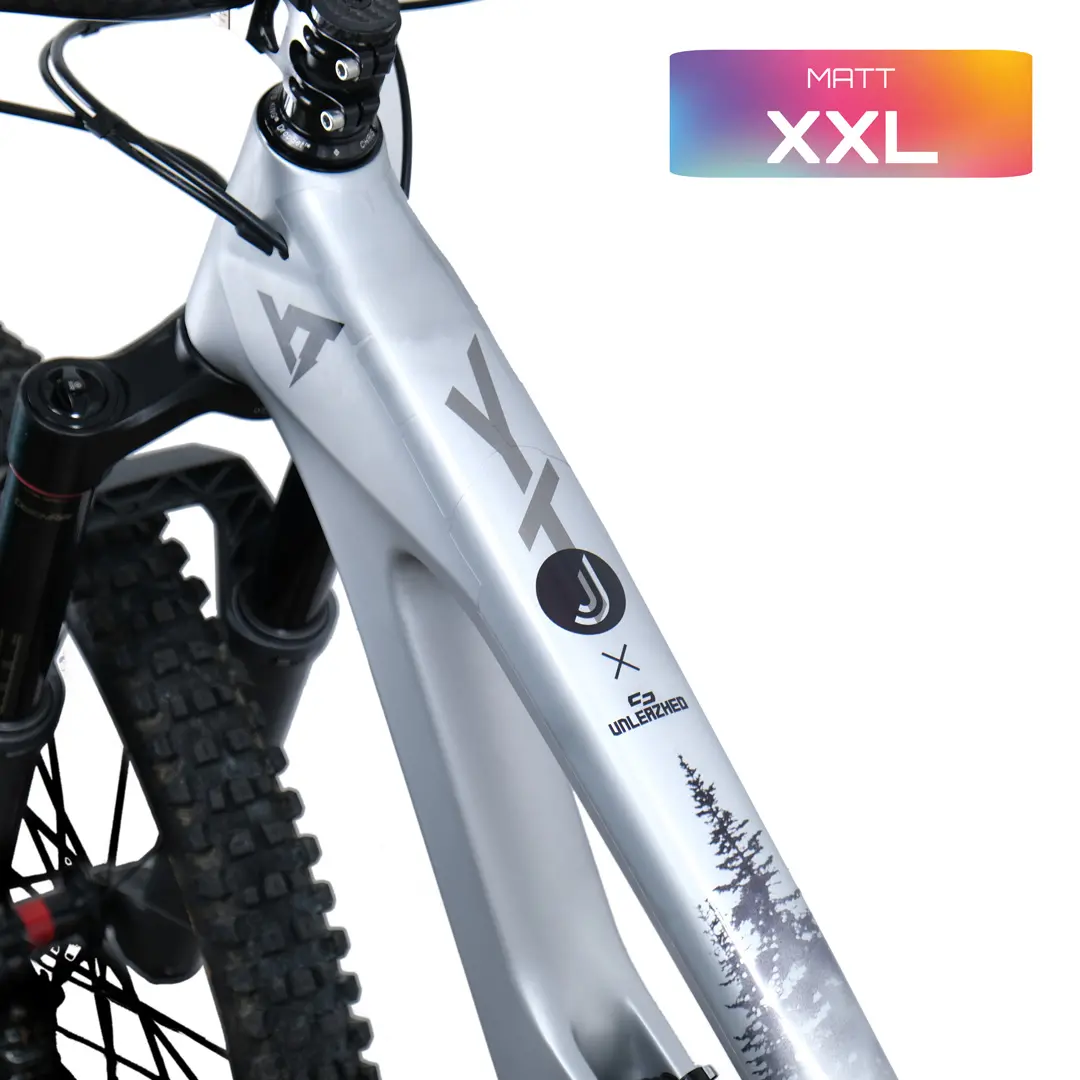 The XXL frame protection set includes bicycle foil for your entire frame, i.e. for the top tube, down tube, seat tube, and rear triangle (seat stays and chain stays), and consists of 35 individual parts!