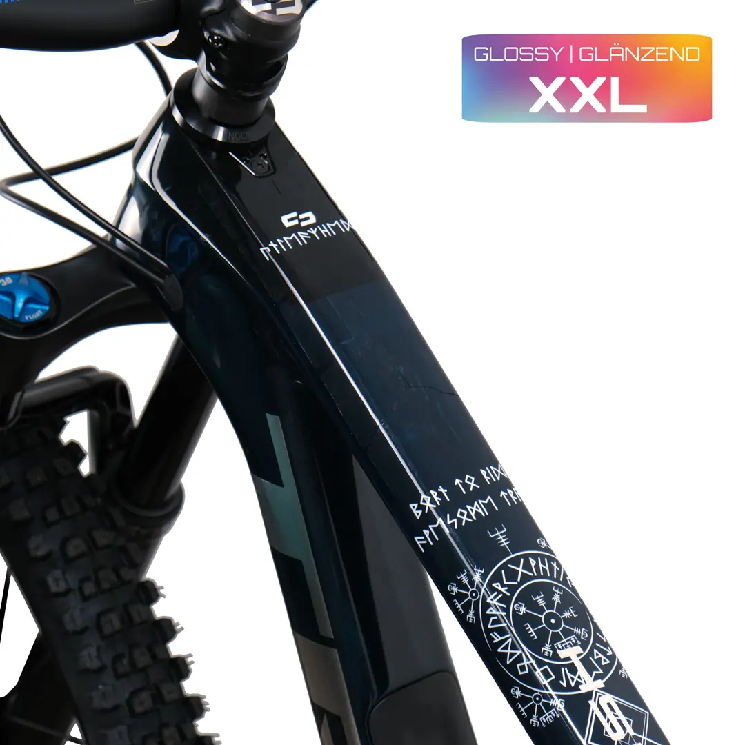 The XXL frame protection set includes bicycle foil for your entire frame, i.e. for the top tube, down tube, seat tube, and rear triangle (seat stays and chain stays), and consists of 35 individual parts!