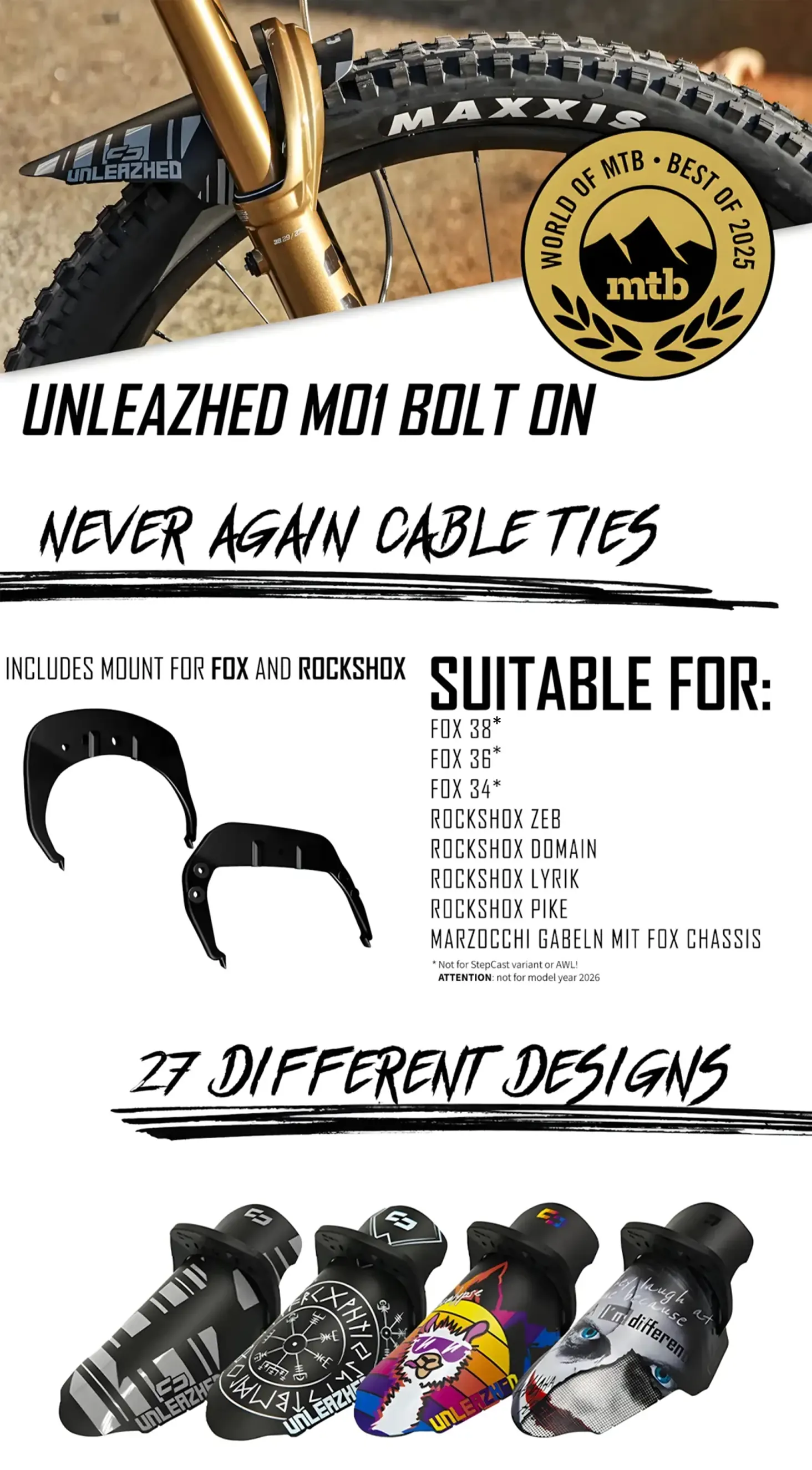 The MTB Mudguard M01 Bolt on is the first bolt-on mini mudguard of its kind! Our large and popular design variety now finds its way into the world of bolt-on mudguards for Fox, Rock Shox and Marzocchi forks with Fox chassis.