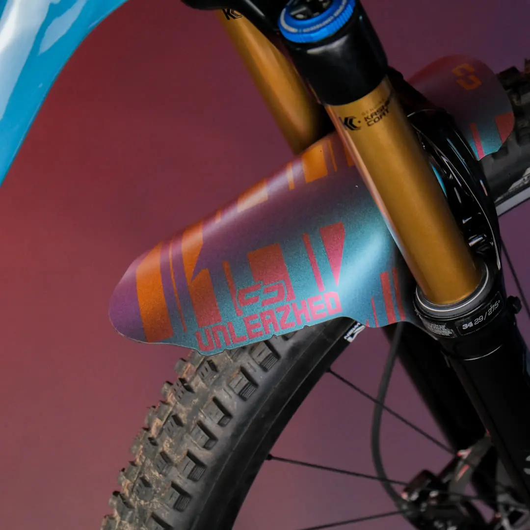 The Unleazhed M01 is larger than the classic Mini Mudguards and provides even more clear visibility on the trail without being unpleasant to look at.