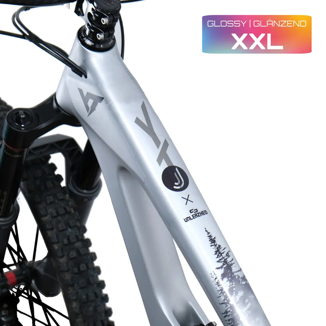 The XXL frame protection set includes bicycle foil for your entire frame, i.e. for the top tube, down tube, seat tube, and rear triangle (seat stays and chain stays), and consists of 35 individual parts!