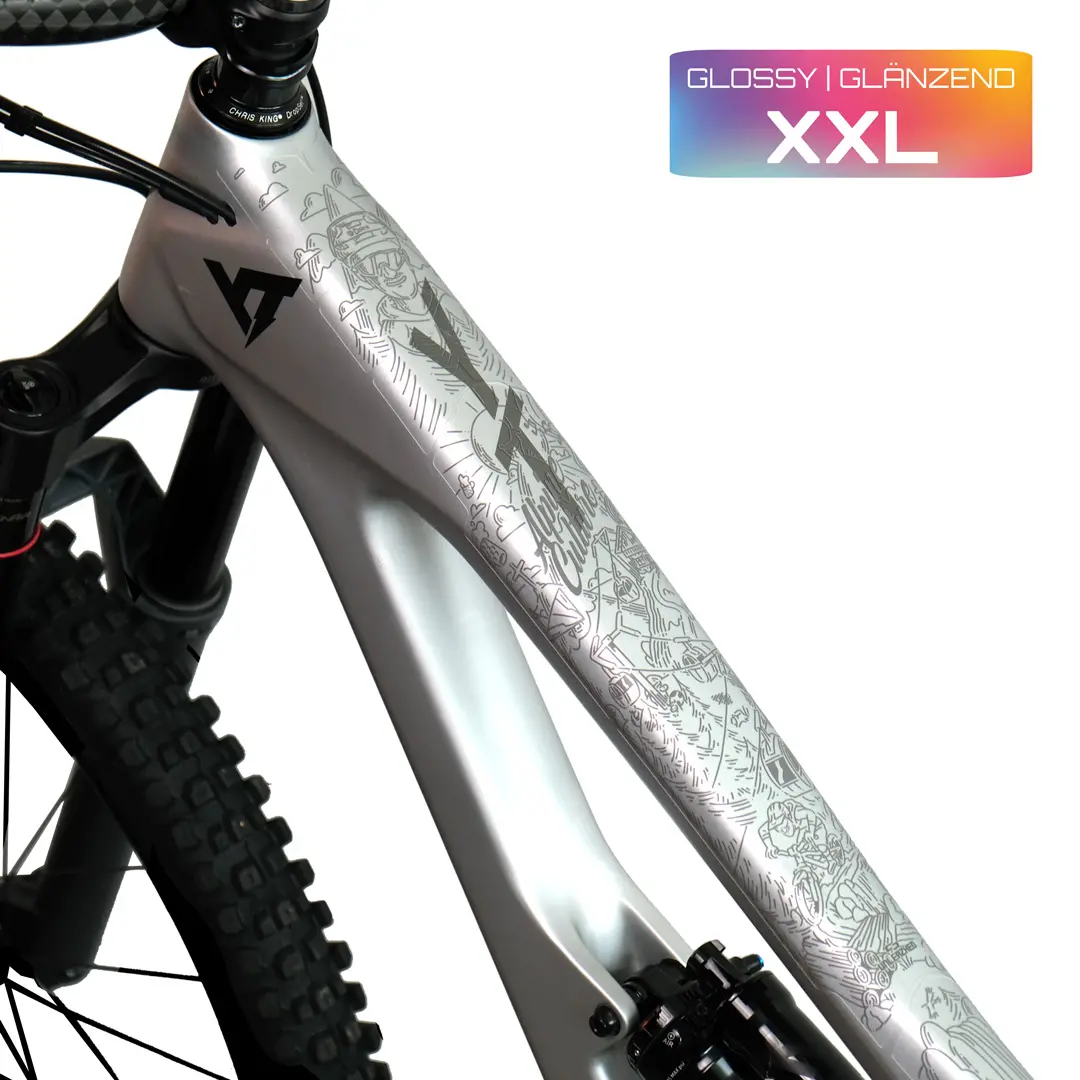 The XXL frame protection set includes bicycle foil for your entire frame, i.e. for the top tube, down tube, seat tube, and rear triangle (seat stays and chain stays), and consists of 35 individual parts!
