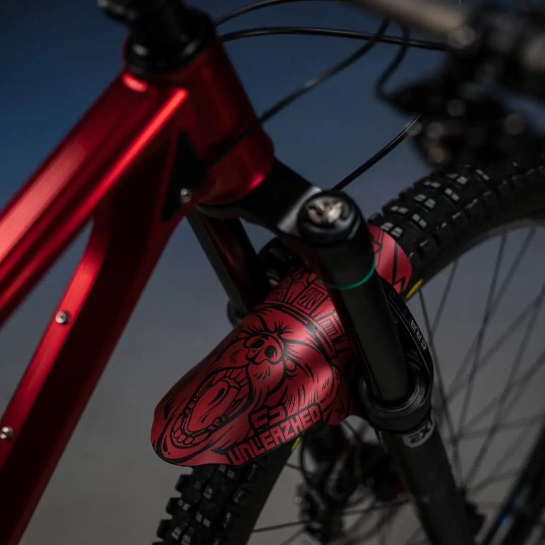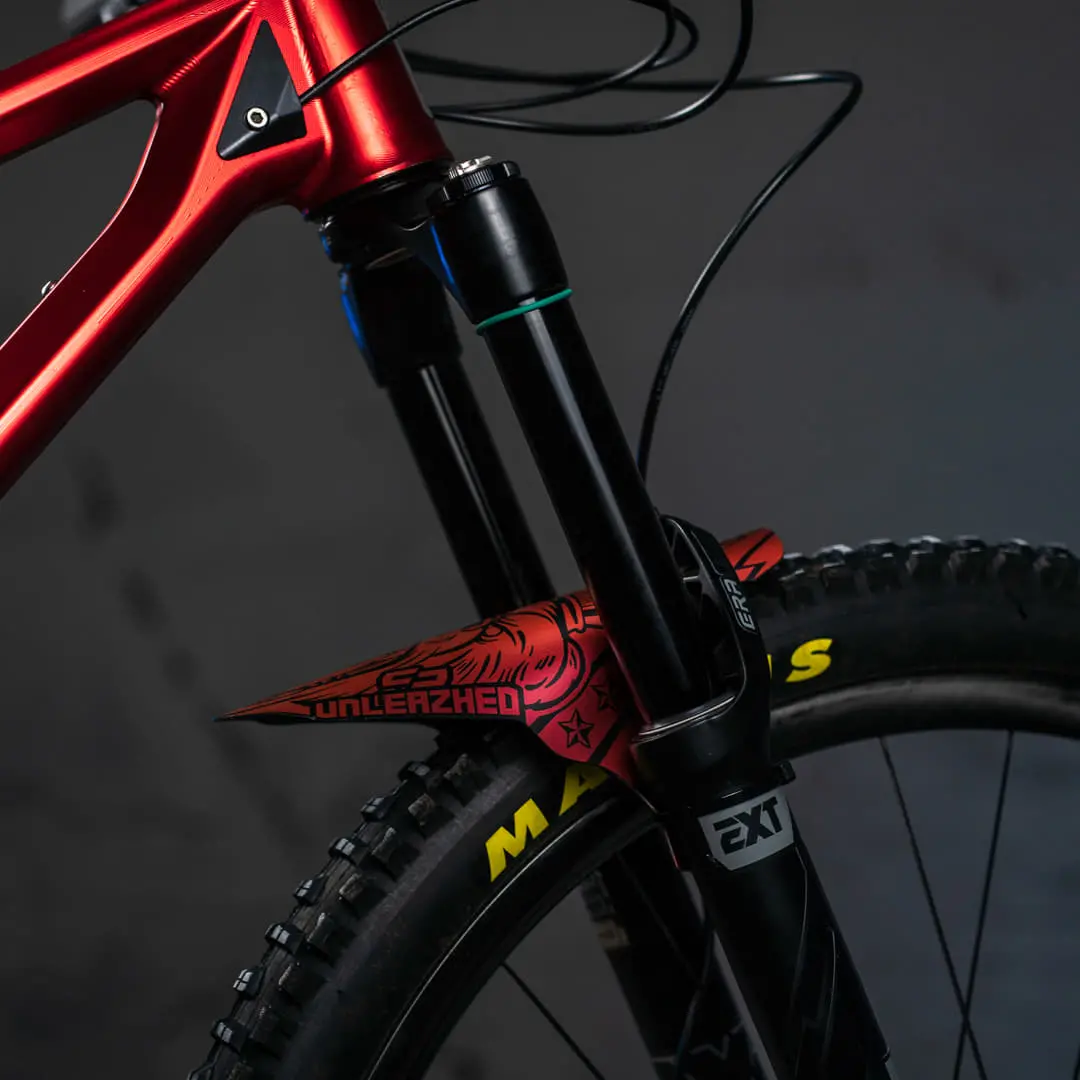 The Unleazhed M01 is larger than the classic Mini Mudguards and provides even more clear visibility on the trail without being unpleasant to look at.