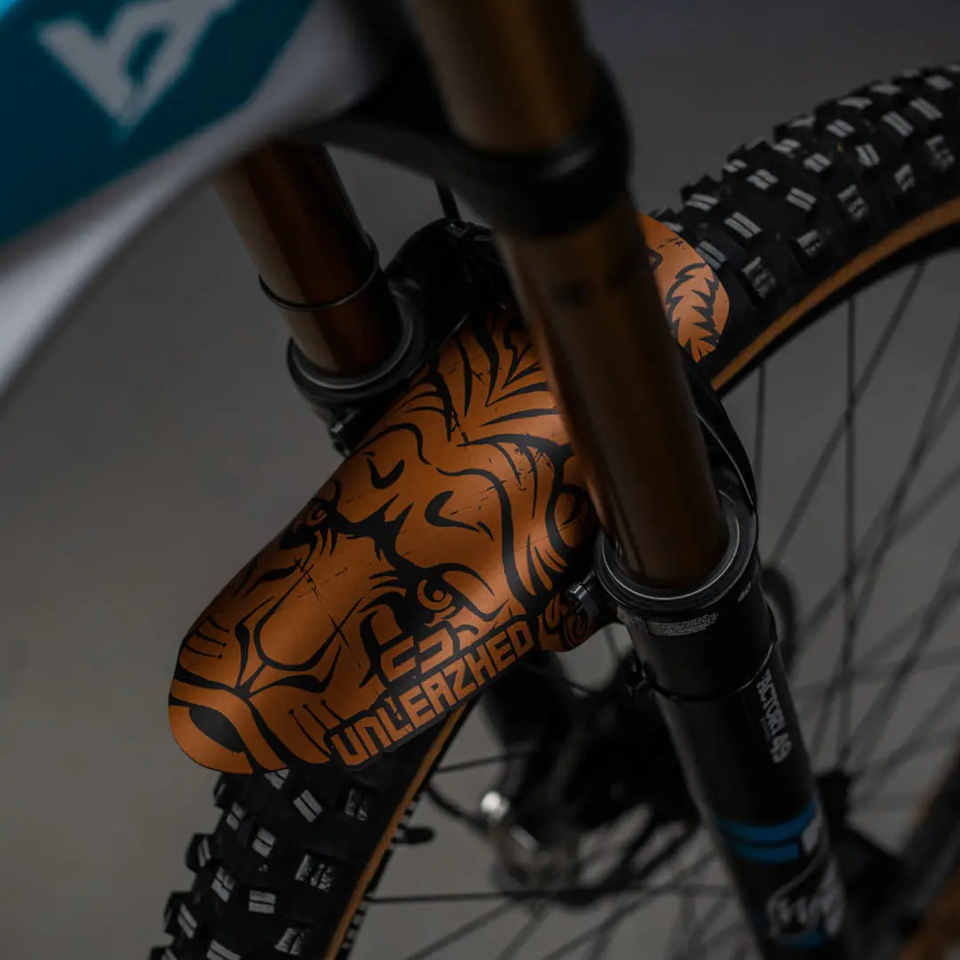 The Unleazhed M01 is larger than the classic Mini Mudguards and provides even more clear visibility on the trail without being unpleasant to look at.