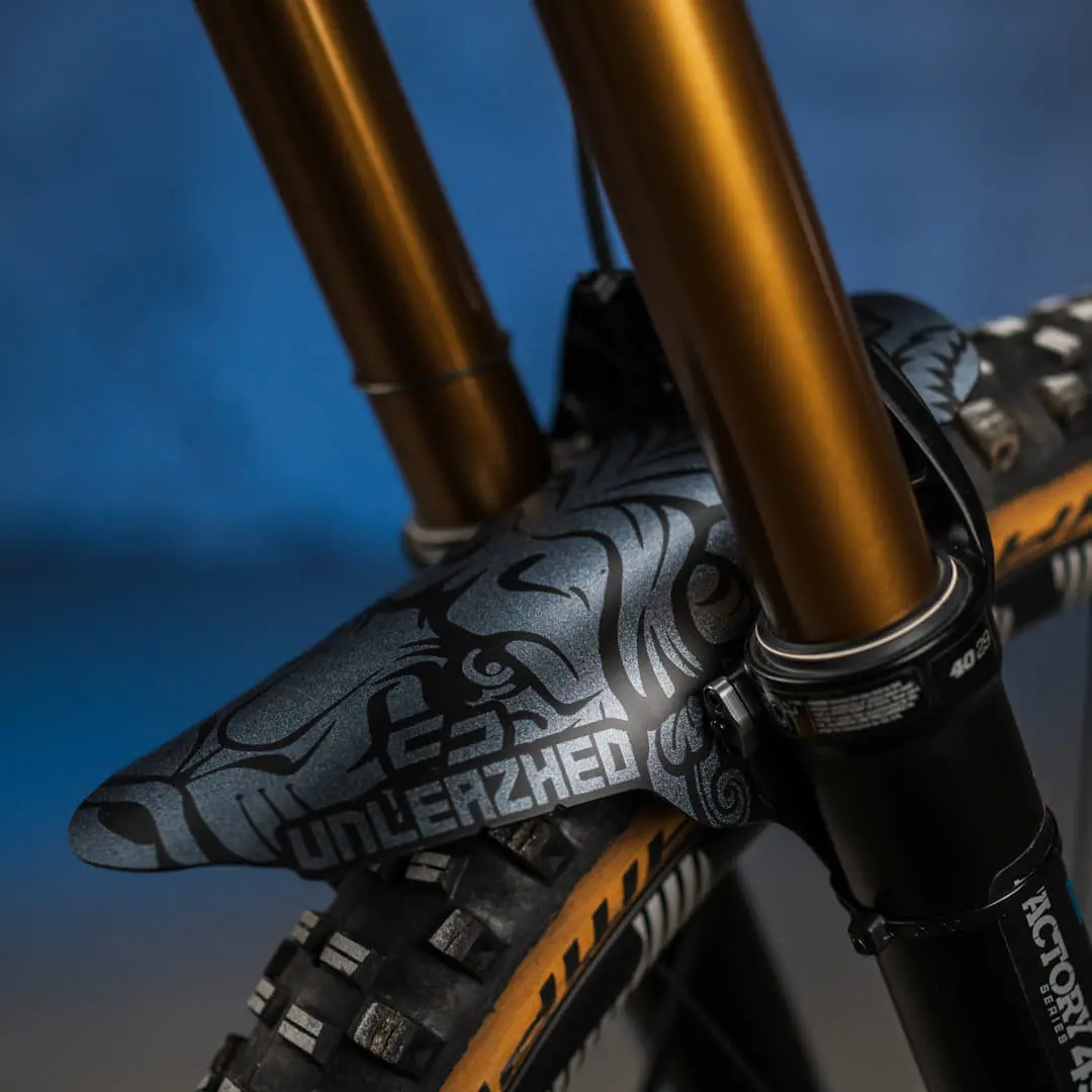 The Unleazhed M01 is larger than the classic Mini Mudguards and provides even more clear visibility on the trail without being unpleasant to look at.