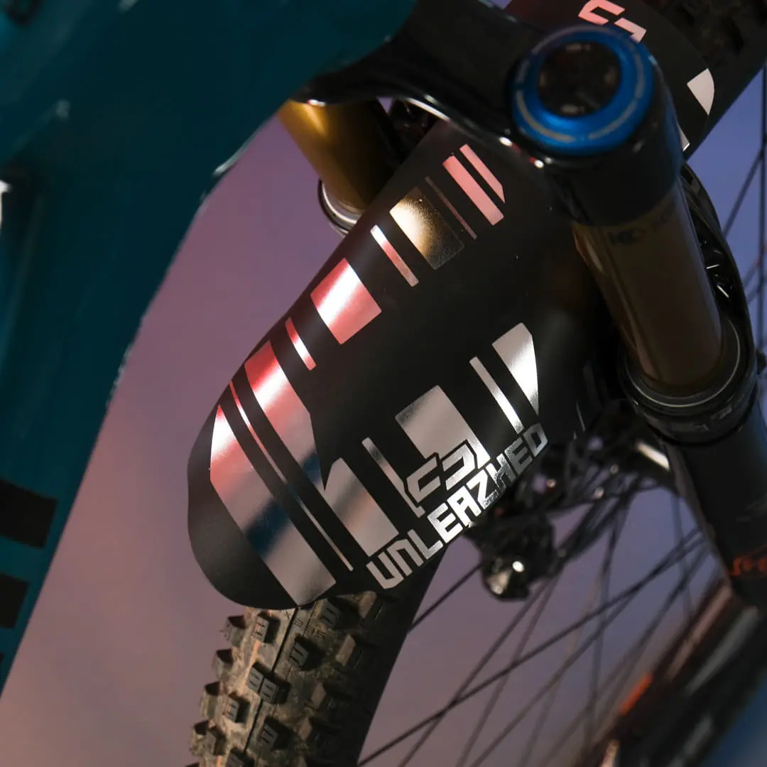 The Unleazhed M01 is larger than the classic Mini Mudguards and provides even more clear visibility on the trail without being unpleasant to look at.